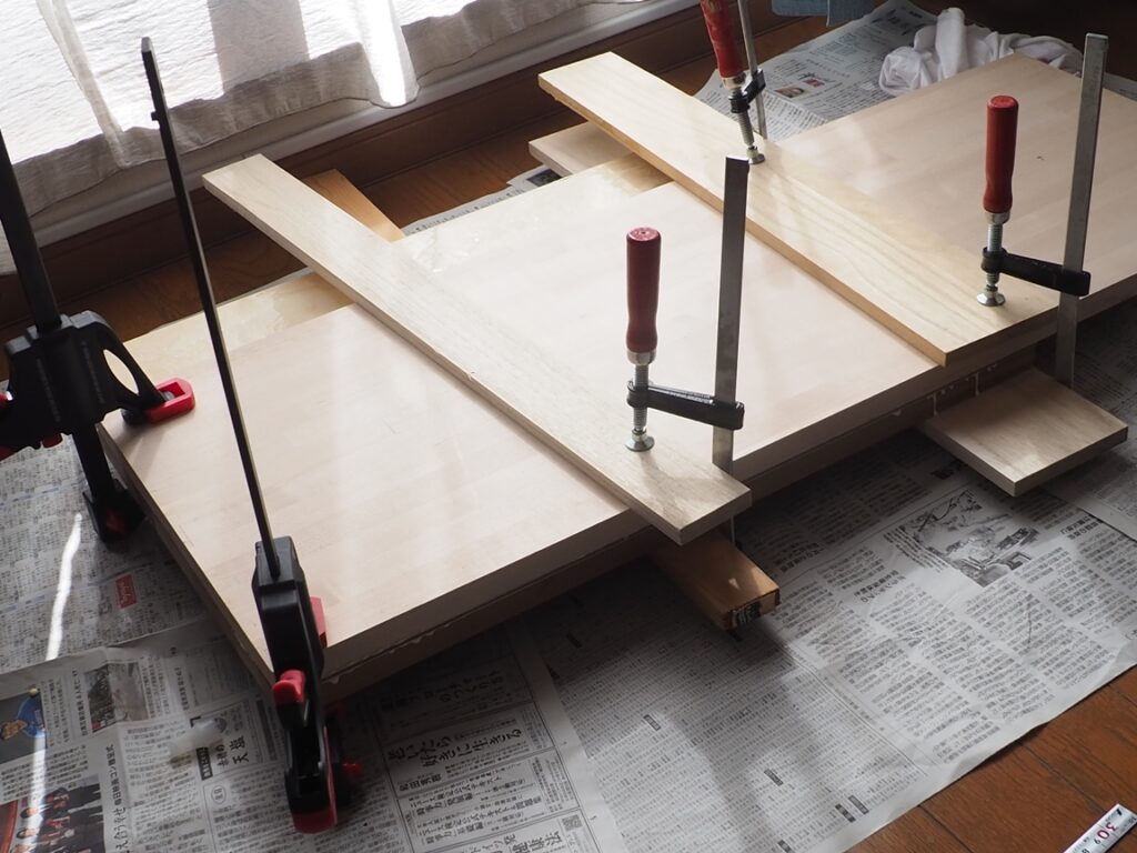 残りの木材も同様にタイトボンドで貼り合わせ、クランプ固定して硬化を待ちます。