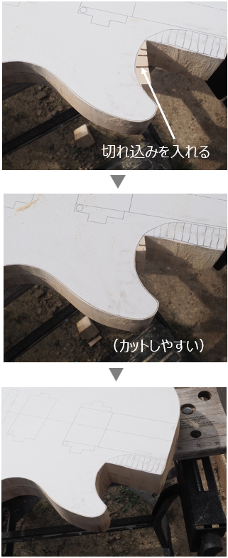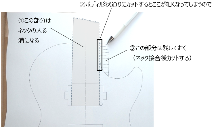 このため、下図③部分の形状は残しておきます→ネックの接合後にカットします。