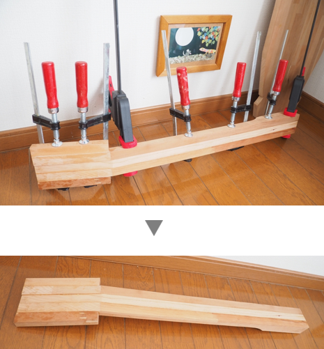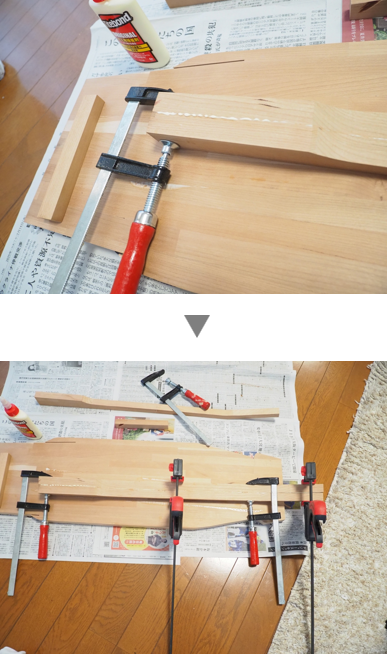 それぞれの板にボンドを塗布したら貼り合わせて、クランプして圧着します。