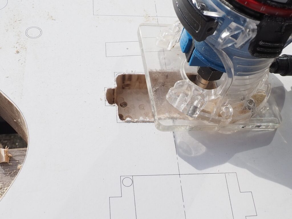 制作編⑫でネック側を整えました。ここではボディ側の加工を行います。 下図の丸で囲んだネックを接合する部分の穴を加工します。 穴の深さは設計値32.3mmですので、この値をターゲットに加工します。加工はトリマーで行います。 トリマー加工の準備 まずネ... -