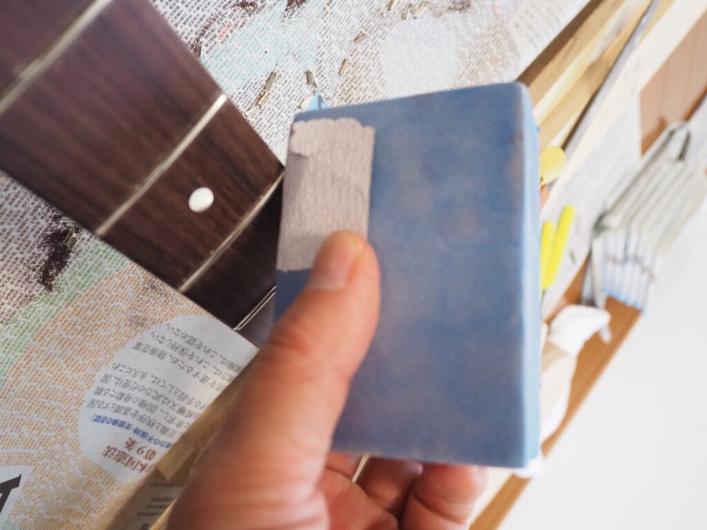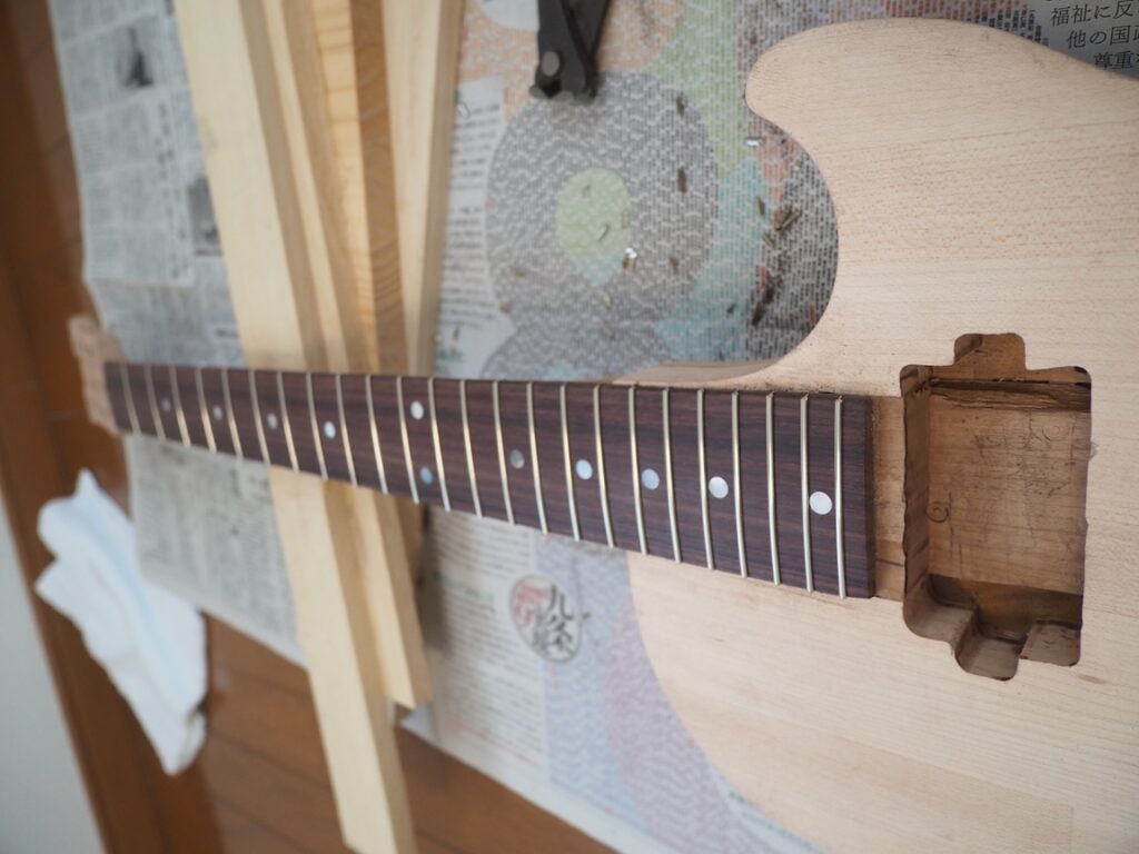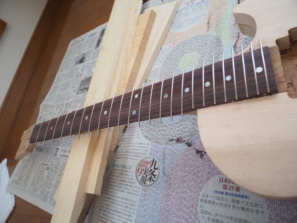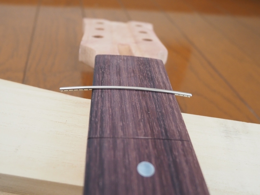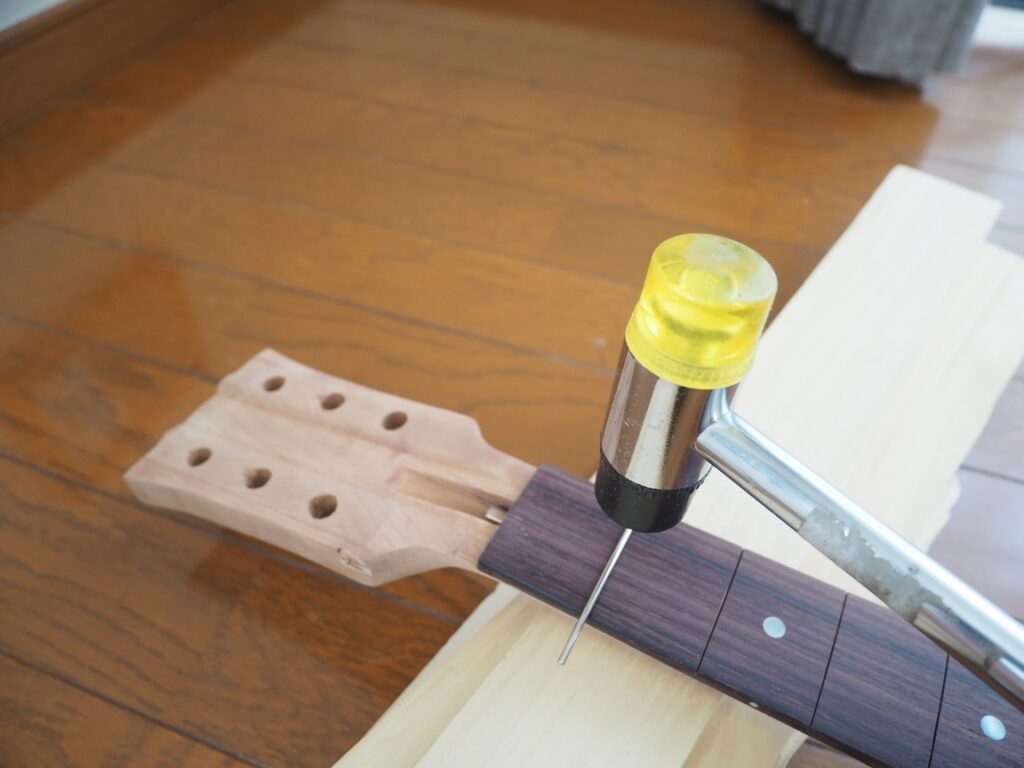 ネックの下に木材などを敷いて、プラハン(プラスチック頭のハンマー)で叩いてフレットを打ち込みます。