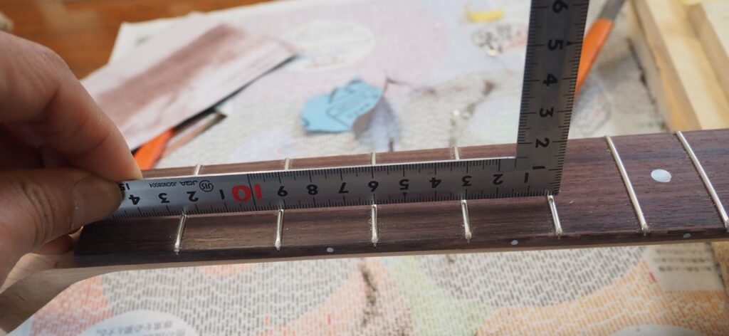 フレットに金尺を当てて平らになっていることを確認しておきます。