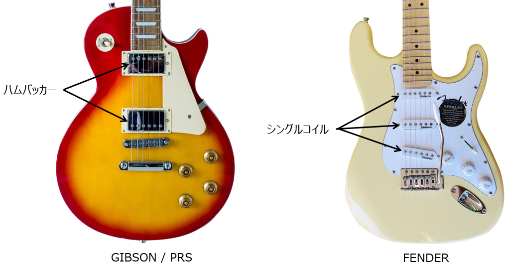 ギブソンは主にコイルを2つ組み合わせた「ハムバッカー」タイプを搭載しており、フェンダーは主にシングルコイルを搭載するモデルが多いです。