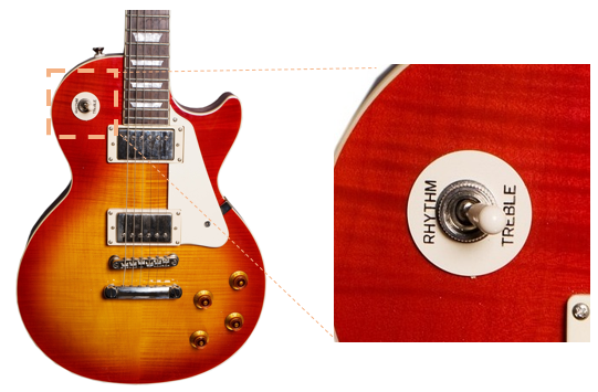 通常、エレキギターはピックアップ(→11)と呼ばれる音を拾う部品が複数搭載されています。