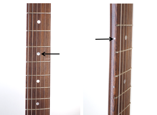 指板上および指板サイドにある目印で、演奏中にフレット位置を確認するためのガイドになります。