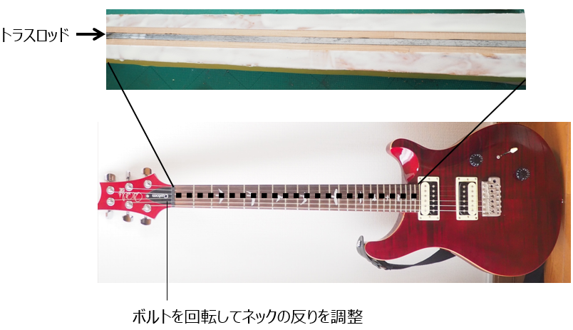 ネック内部に埋め込まれた金属の棒で、ボルトを回転させることでネックの反りを調整することができます。