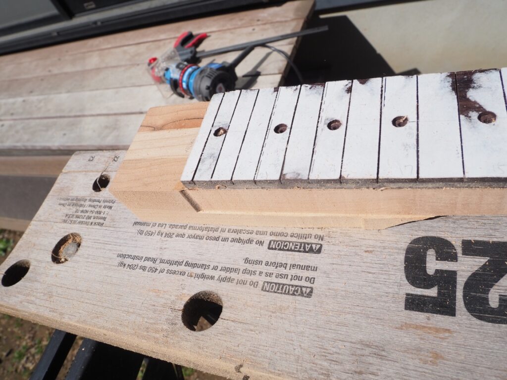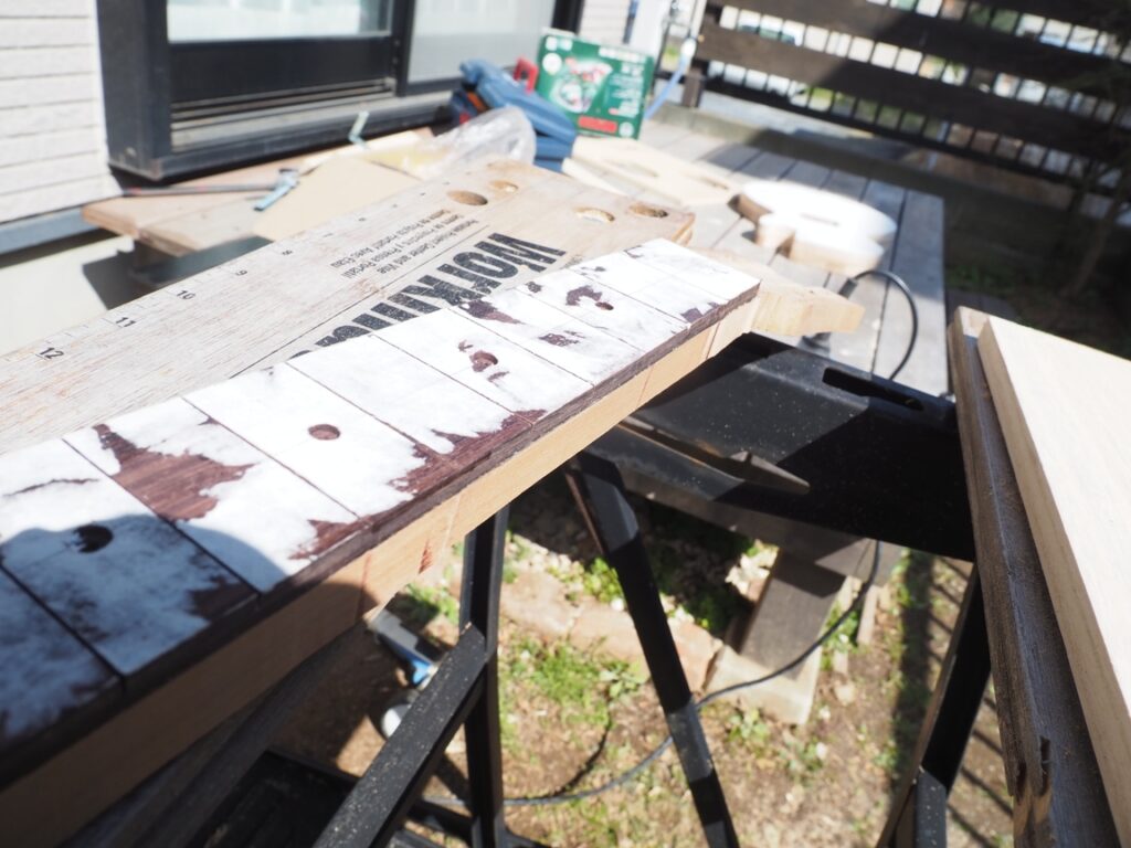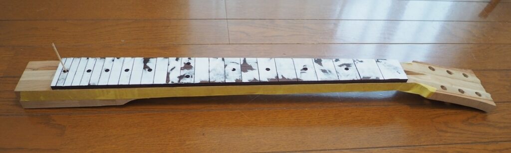 指板とネックは「制作編⑨ 指板とネックの接着」で接着固定した状態です↓