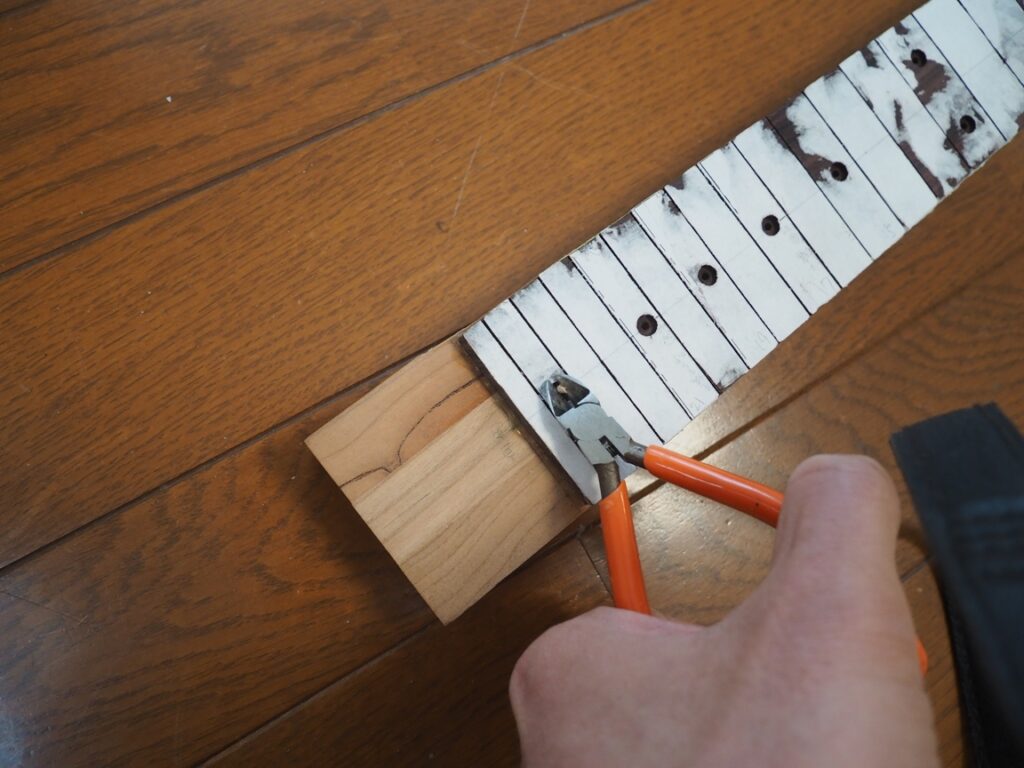 まず指板接着の際にズレ防止のために差し込んだつまようじをニッパーでカットします。