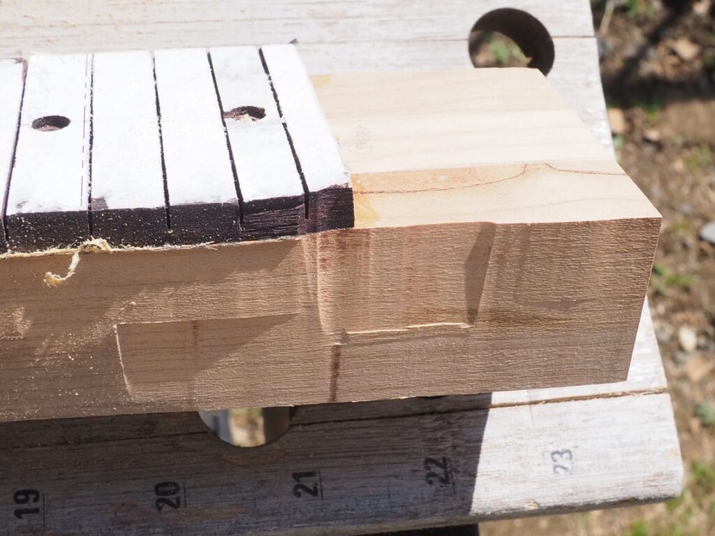 次の写真で示すように現状はデコボコなので、できるだけ面を出すように削っていきます。