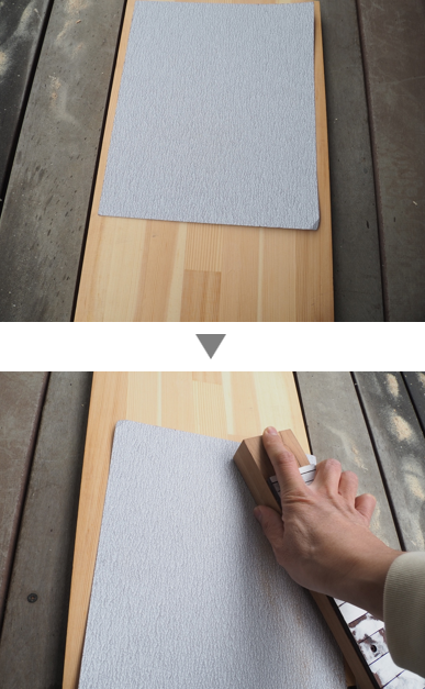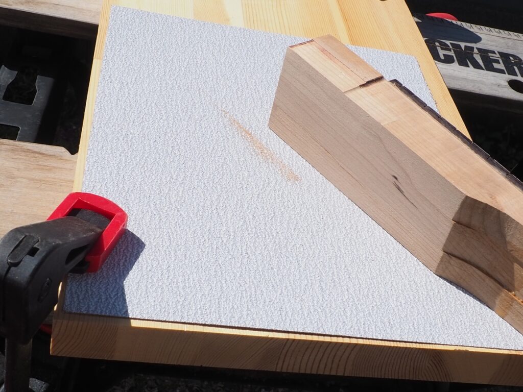 サンドペーパーを平らな面(木材)に載せて、そこにネックの削りたい面を当てて擦ります。