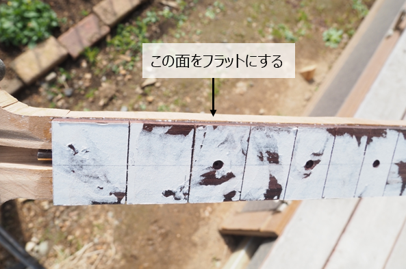 写真に示す面を指板に沿ってカットします。