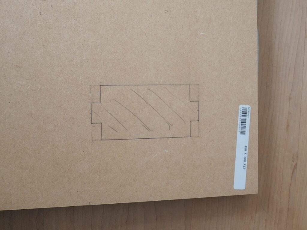 MDFボードに上記の穴形状を書き込みます。