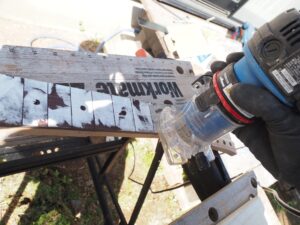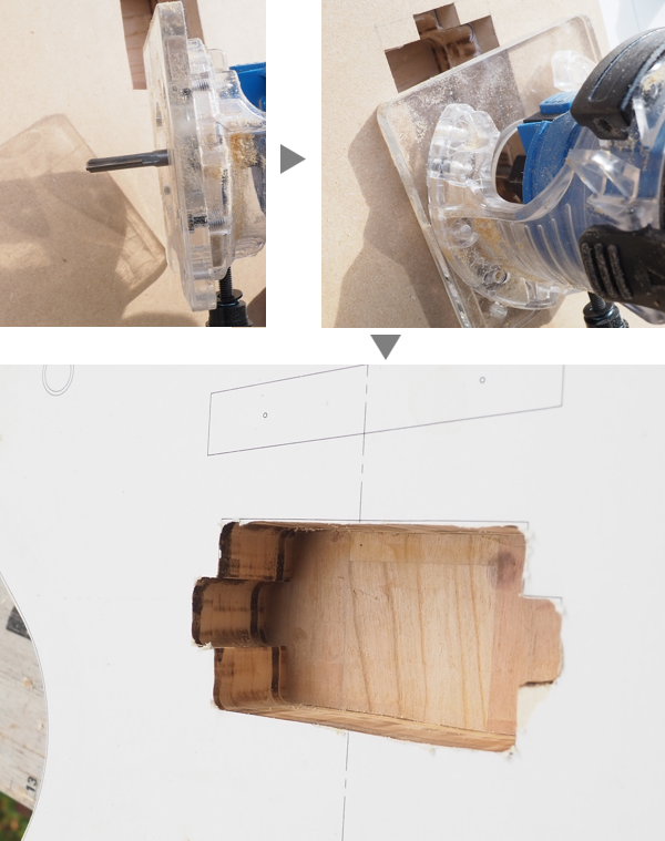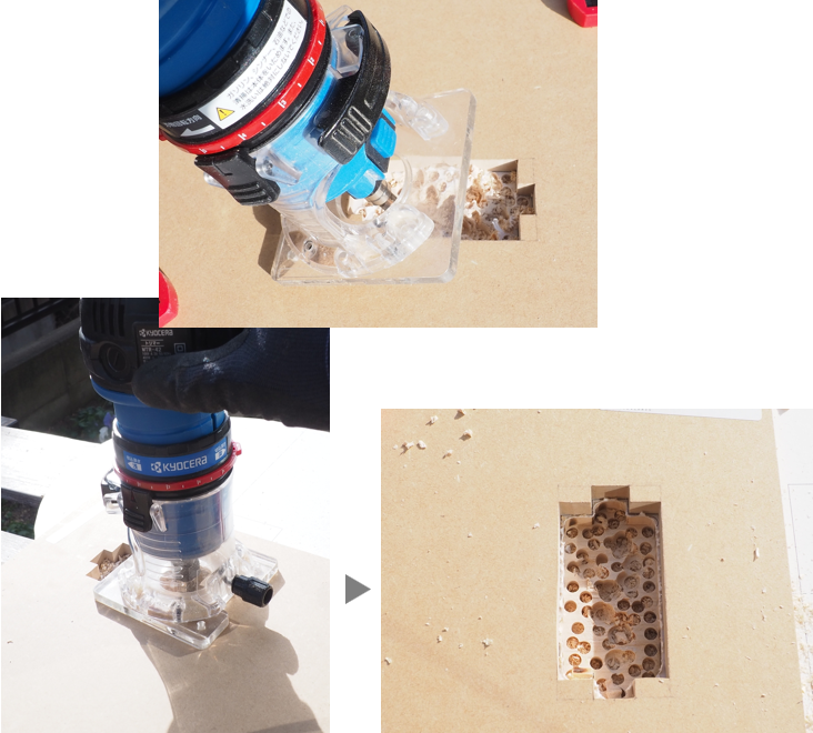 なお、トリマーで一定程度以上深く加工すると刃が届かなくなりますので、そうなったら型板を外して加工します。