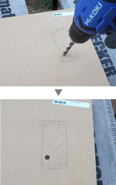ジグソーで加工しますが、まずジグソーの刃を入れる足掛かりの穴をドリルで作成します。