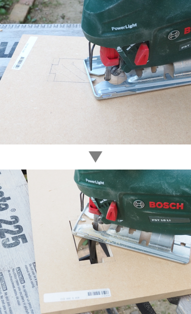 ドリルで穴をあけたことでジグソーの刃が差し込めます。